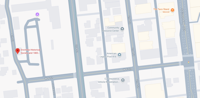 The Encinitas Historical Society is located in the 1883 Schoolhouse, a stone’s throw east of Moonlight Beach and one block west of Coast Highway 101, the heart of the City’s downtown district.