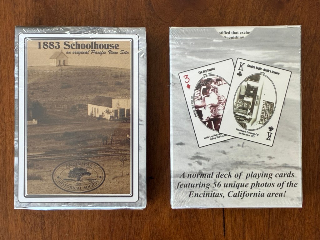 At the 1883 Schoolhouse you will find unique gifts priced for family budgets. We have books, historical issues of local magazines, large-format photo prints, watercolors, playing cards with photos of old Encinitas, holiday ornaments, a wide variety of historical postcards, DVD’s, T-shirts with the EHS logo or the Heritage Tree. We are not set up for mail order, so we welcome you to visit the Schoolhouse to make your selections.